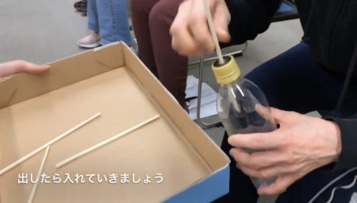 ①ペットボトルに中に割りばしを入れ、ペットボトルを振って中の割りばしを出していく